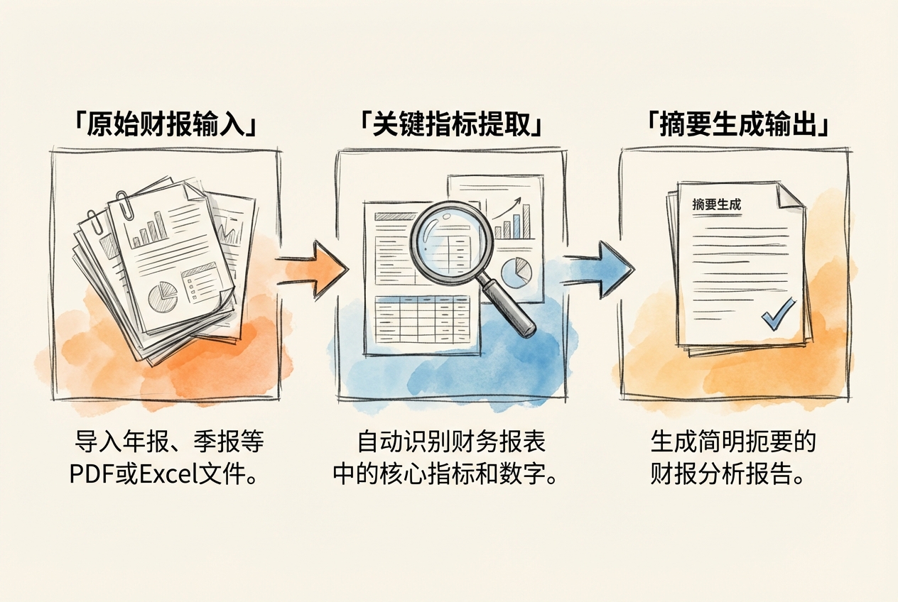 本技能实现「数据提取 → 指标计算 → 摘要生成」三步财报分析流程。