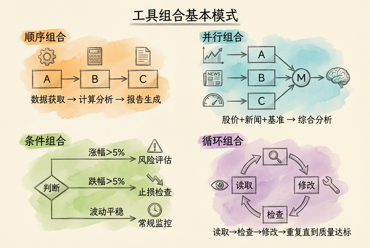 智能体在执行复杂任务时,通常需要调用多个工具。根据工具之间的关系,组合模式分为四种。