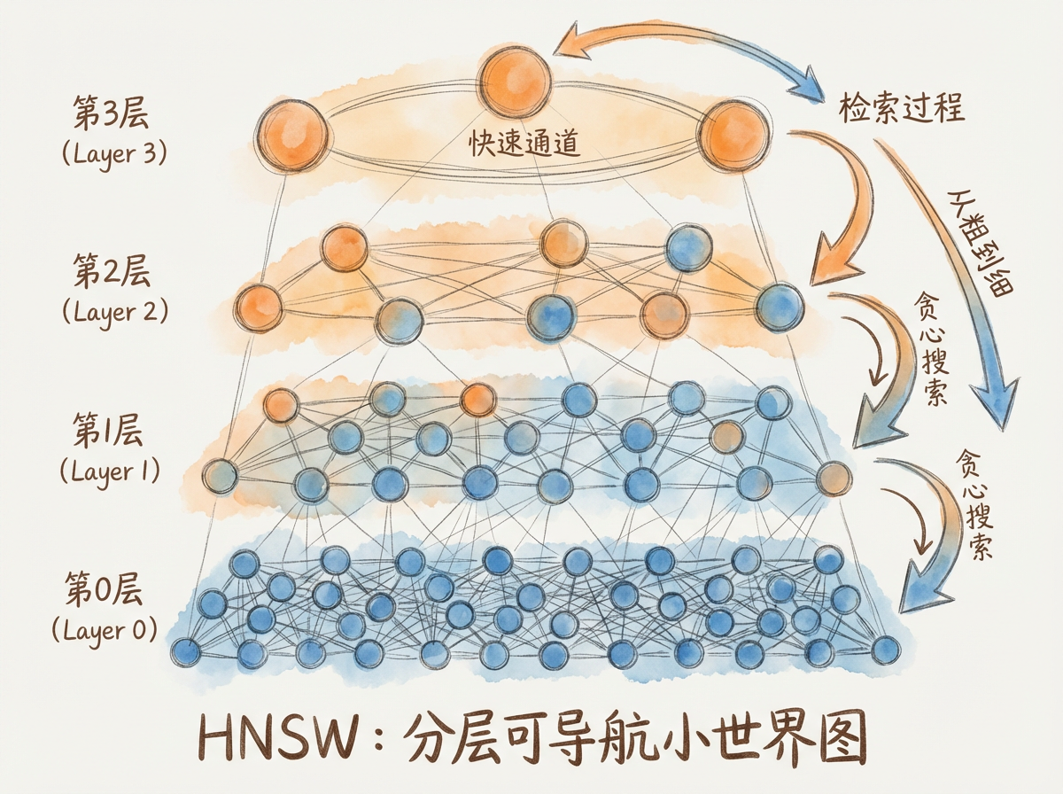 HNSW(Hierarchical Navigable Small World,分层可导航小世界图)是目前最流行的 ANN 索引算法。理解它的原理有助于选择合适的参数配置。